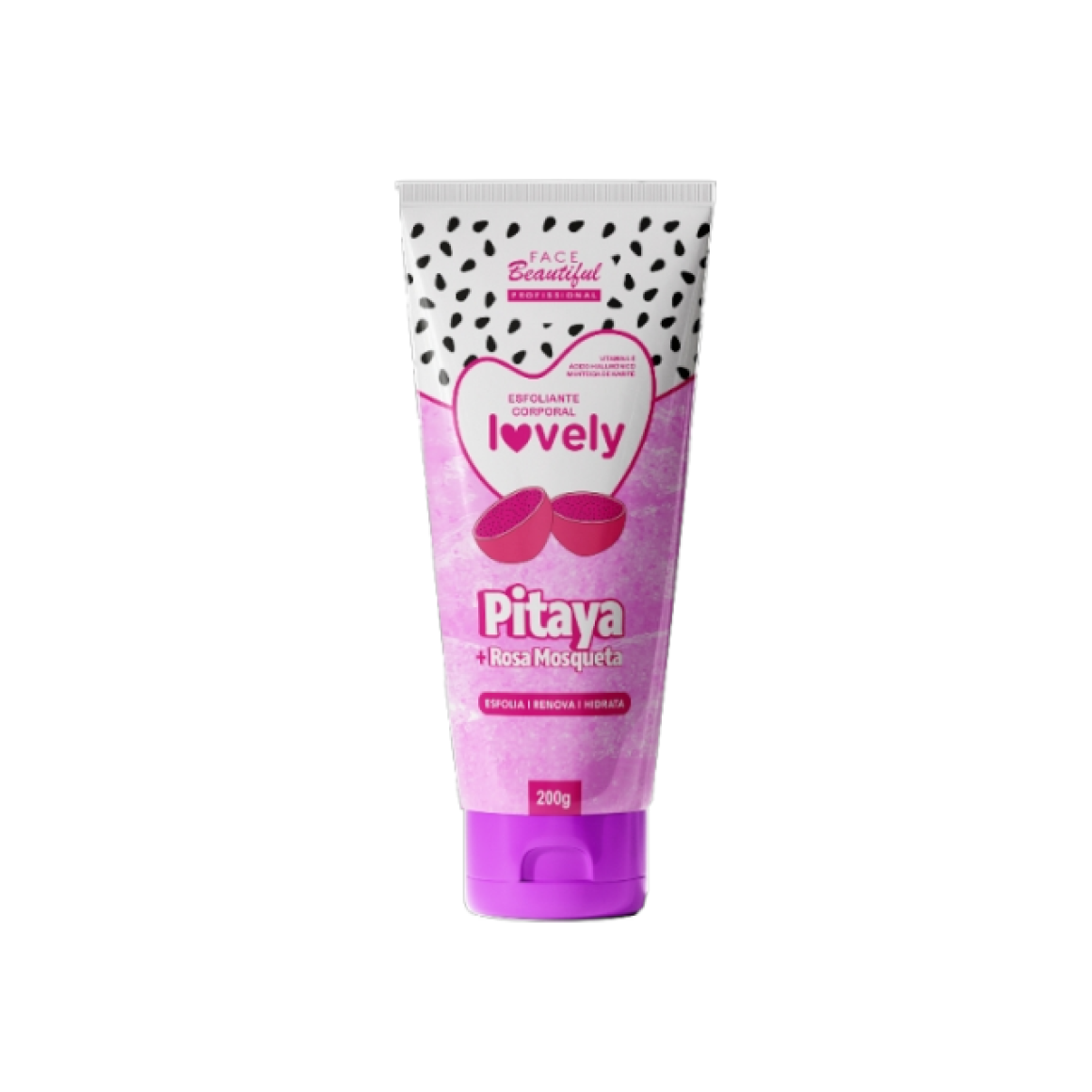 Descrição: O Esfoliante Corporal Pitaya e Rosa Mosqueta Lovely, de Face Beautiful foi desenvolvido com microesfereras esfoliantes e fórmula enriquecida de Vitamina E, Ácido Hialurônico e Manteiga de Karité; que estimula a renovação celular e remove células mortas.