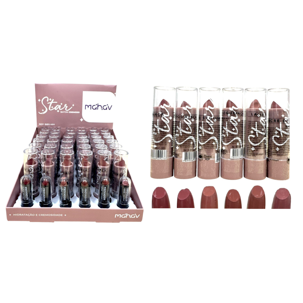 Descrição: Batom Bastão Star Mahav oferece textura cremosa e suave que desliza facilmente nos lábios, proporcionando aplicação uniforme e confortável.