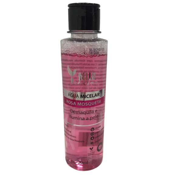 Descrição: Agua micelar Bello Charme, possui uma tecnologia inovadora de ativos que auxiliam na limpeza da pele, tonificação, efeito demaquilante e associado ao extrato de rosa mosqueta e ao acido hialurônico que auxiliam na hidratação, vitalidade e fecha os poros.