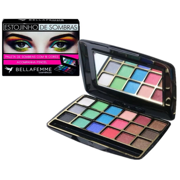 Descrição: Estojo Paleta De Sombras Com Espelho E Pincel Bella Femme possui 18 tons de sombra fosca para composição de looks variados. O formato compacto é ideal para levar na necessaire, otimizando espaço.