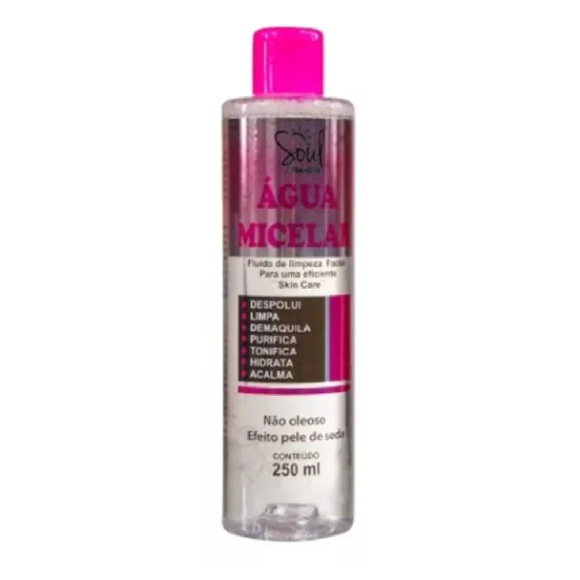 Descrição: A Água Micelar da Soul Cosméticos é um fluido de limpeza facial para um eficiente skin care! Ela despolui, limpa, demaquila, purifica, tonifica, hidrata, acalma e protege a pele. Ela não é oleosa e deixa a pele com efeito pele de seda.
