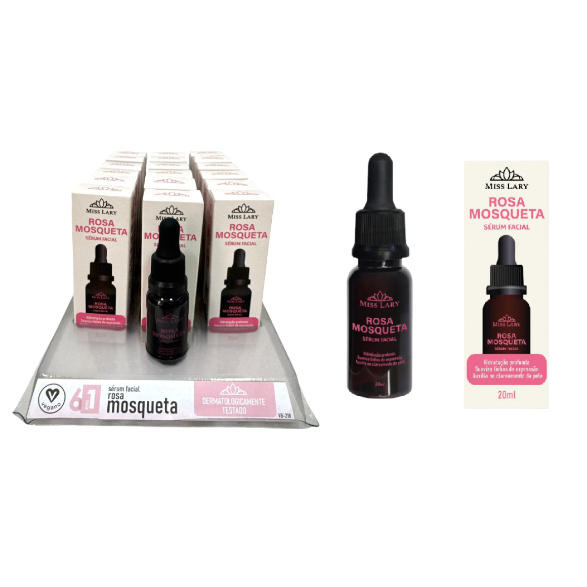 Descrição: O Sérum Facial Rosa Mosqueta da Miss Lary é um produto rejuvenescedor que oferece múltiplos benefícios para a pele. Sua fórmula contém Extrato de Rosa Mosqueta, Óleo de Romã, Vitamina E e Esqualano, que promovem a renovação celular, redução dos sinais de envelhecimento e linhas de expressão, clareamento e uniformização do tom da pele, efeito tensor e ação antioxidante.